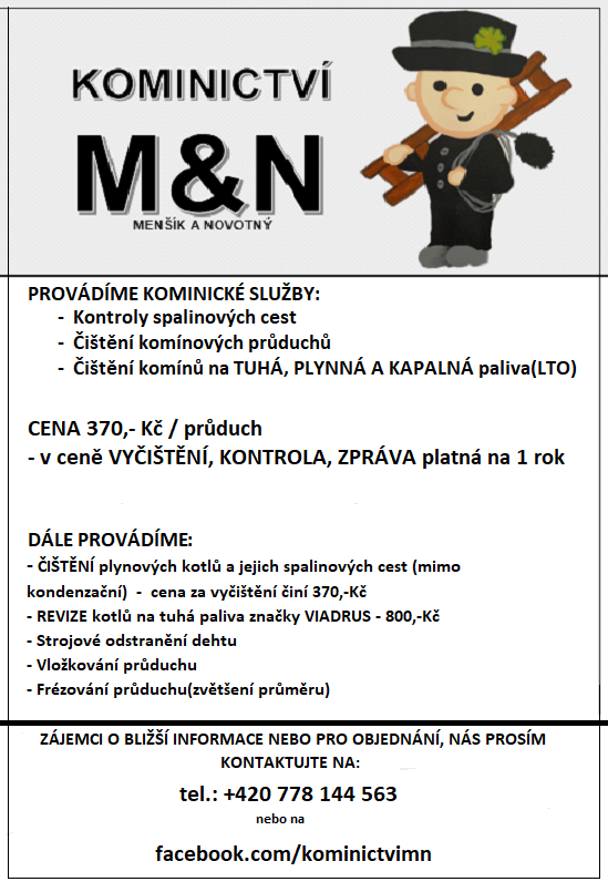 Kominictví Menšík a Novotný bude dne 15. 3. 2022 provádět v naší obci kontrolu a čištění komínů. Informace naleznete v příloze.