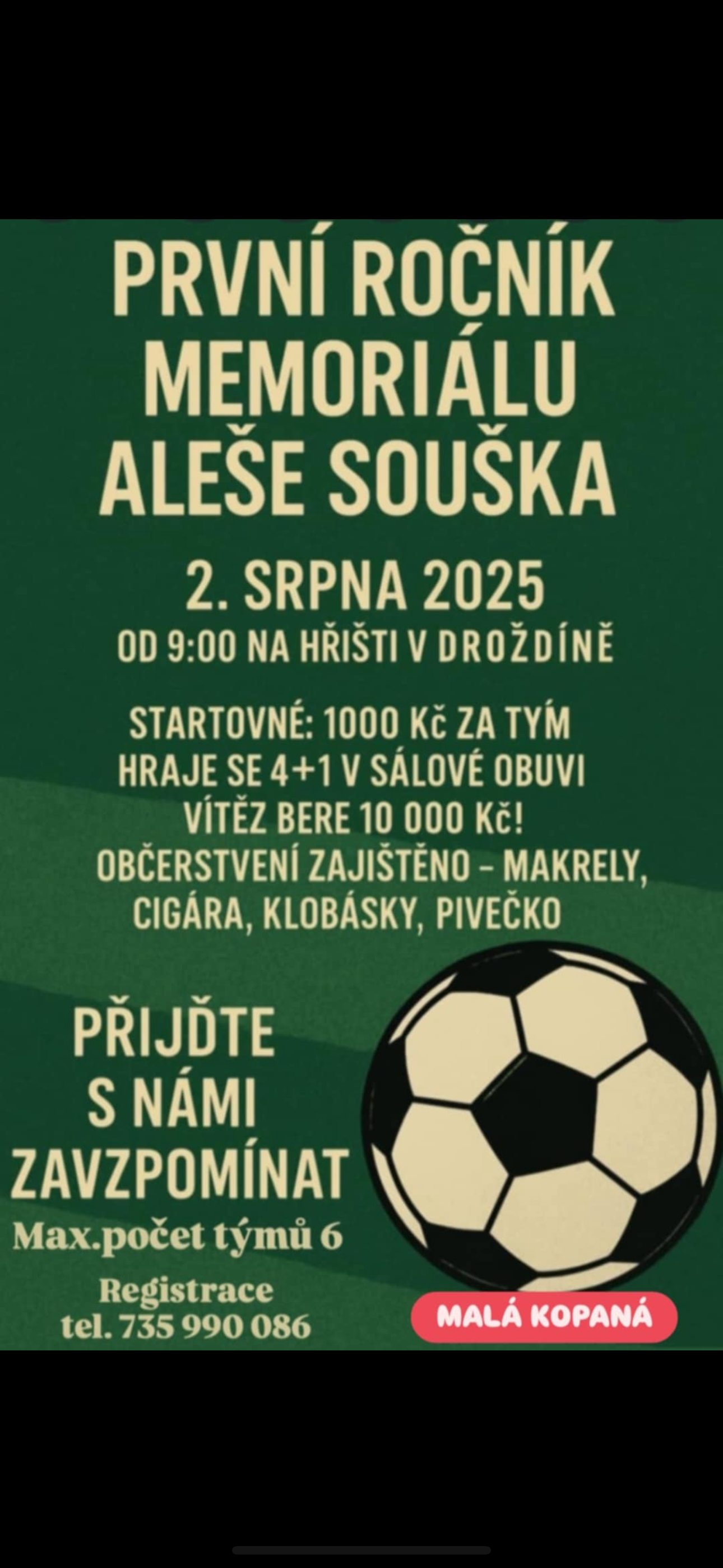Dne 2.8.2025 se na hřišti v Droždíně uskuteční první ročník memoriálu Aleše Souška v malé kopané.