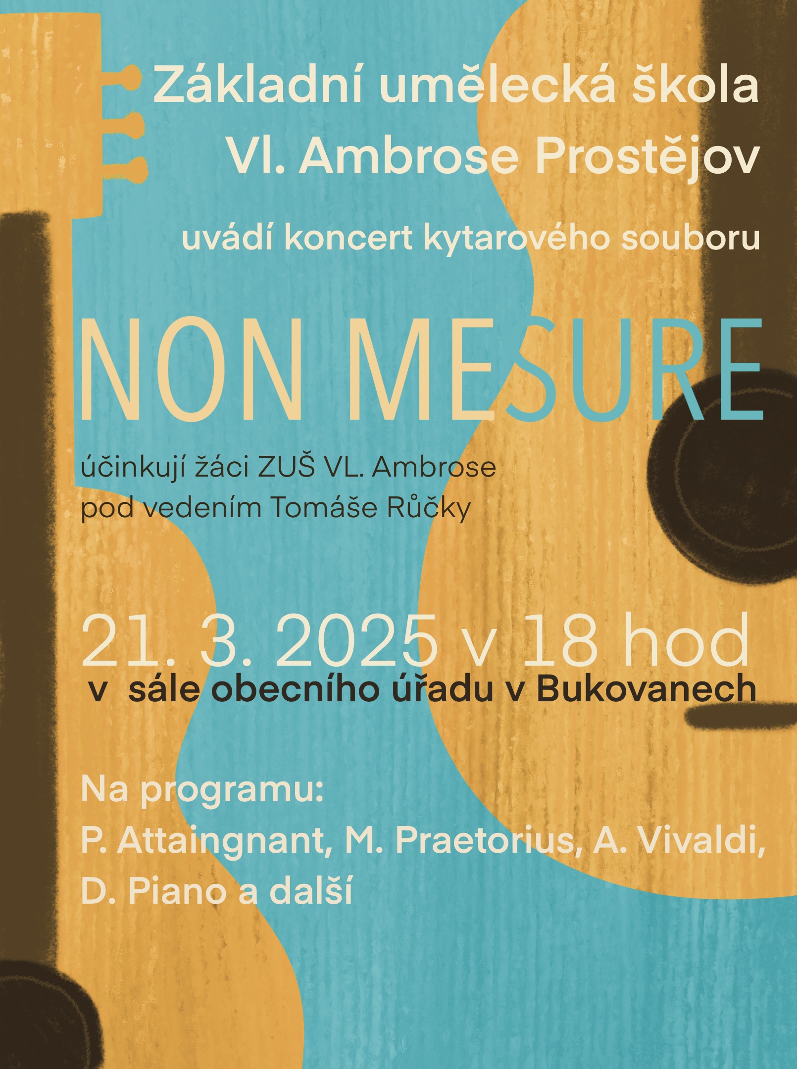 Dne 21.3. v 18 hodin vystoupí ve společenské místnosti na půdě obecního úřadu kytarový soubor žáků ZUŠ Vl. Ambrose NON MESURE. Informace o programu naleznete v příloze.