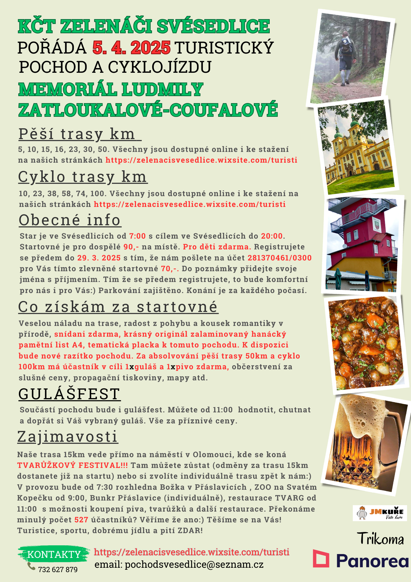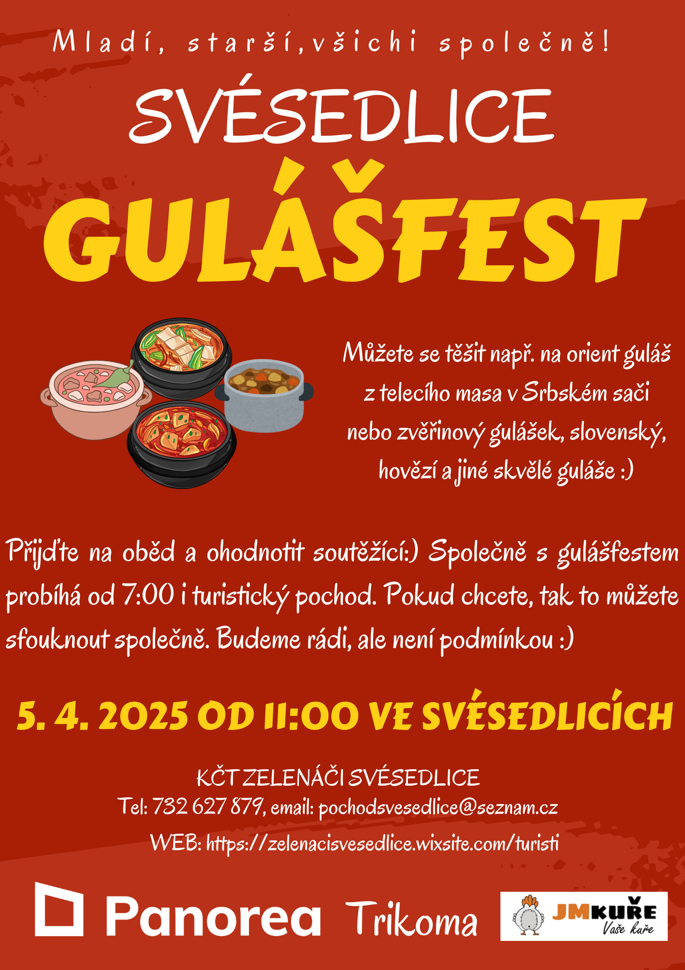 Klub českých turistů Zelenáči Svésedlice srdečně Vás zve 5. 4. 2025 na pochod a cyklojízdu spojenou s gulášfestem která se koná ve Svésedlicích. Start pochodu a cyklojízdy je od 7:00 do 11:00. Gulášfest začíná od 11:00.