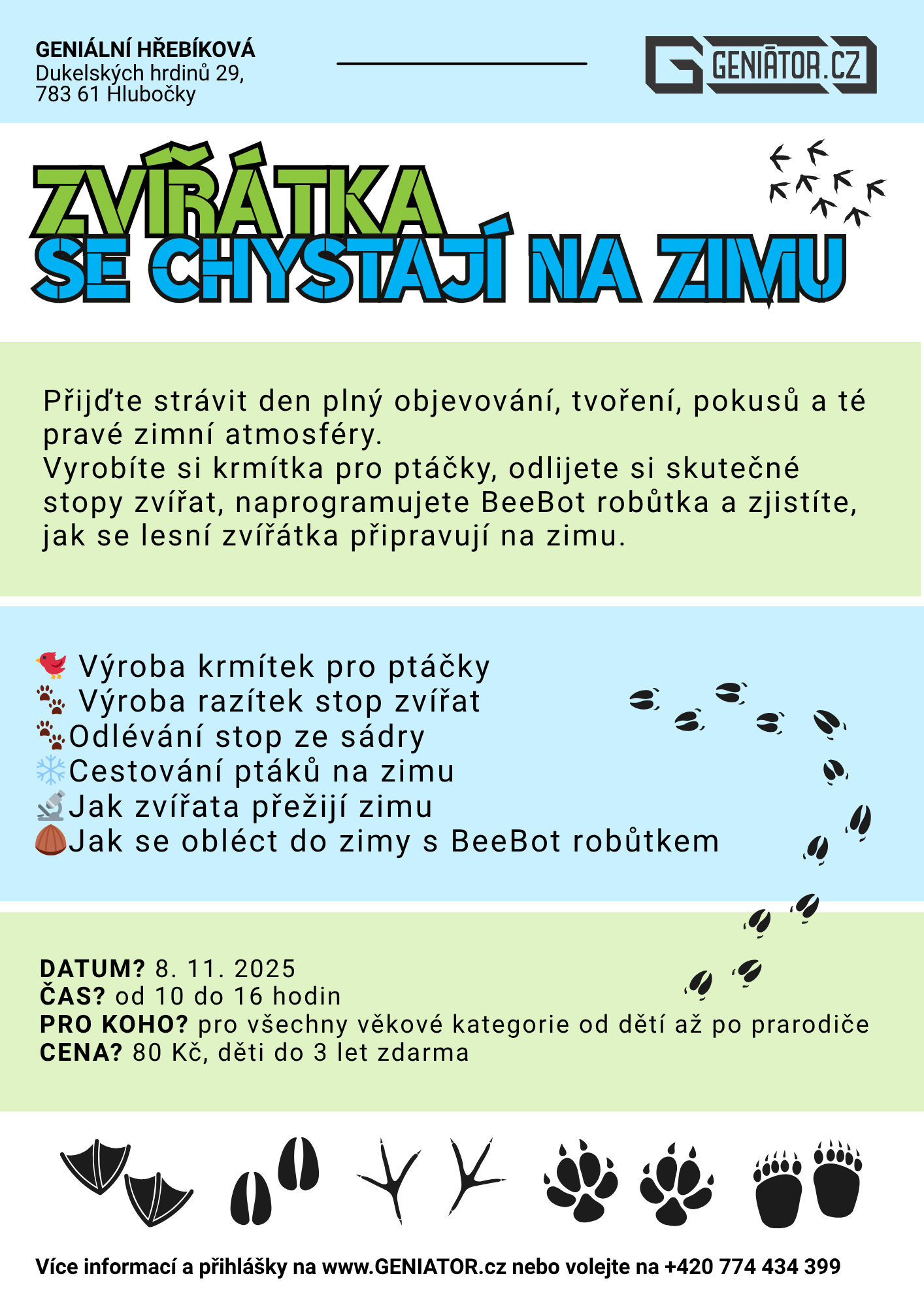 Více informací a rezervace na www.geniator. cz nebo na 774 434 399