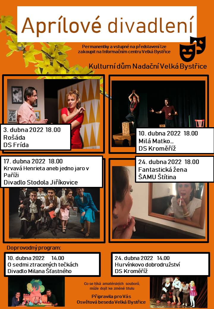 Informační centrum Velká Bystřice zahájilo předprodej vstupenek a permanentek na nesoutěžní divadelní přehlídku Aprílové divadlení.