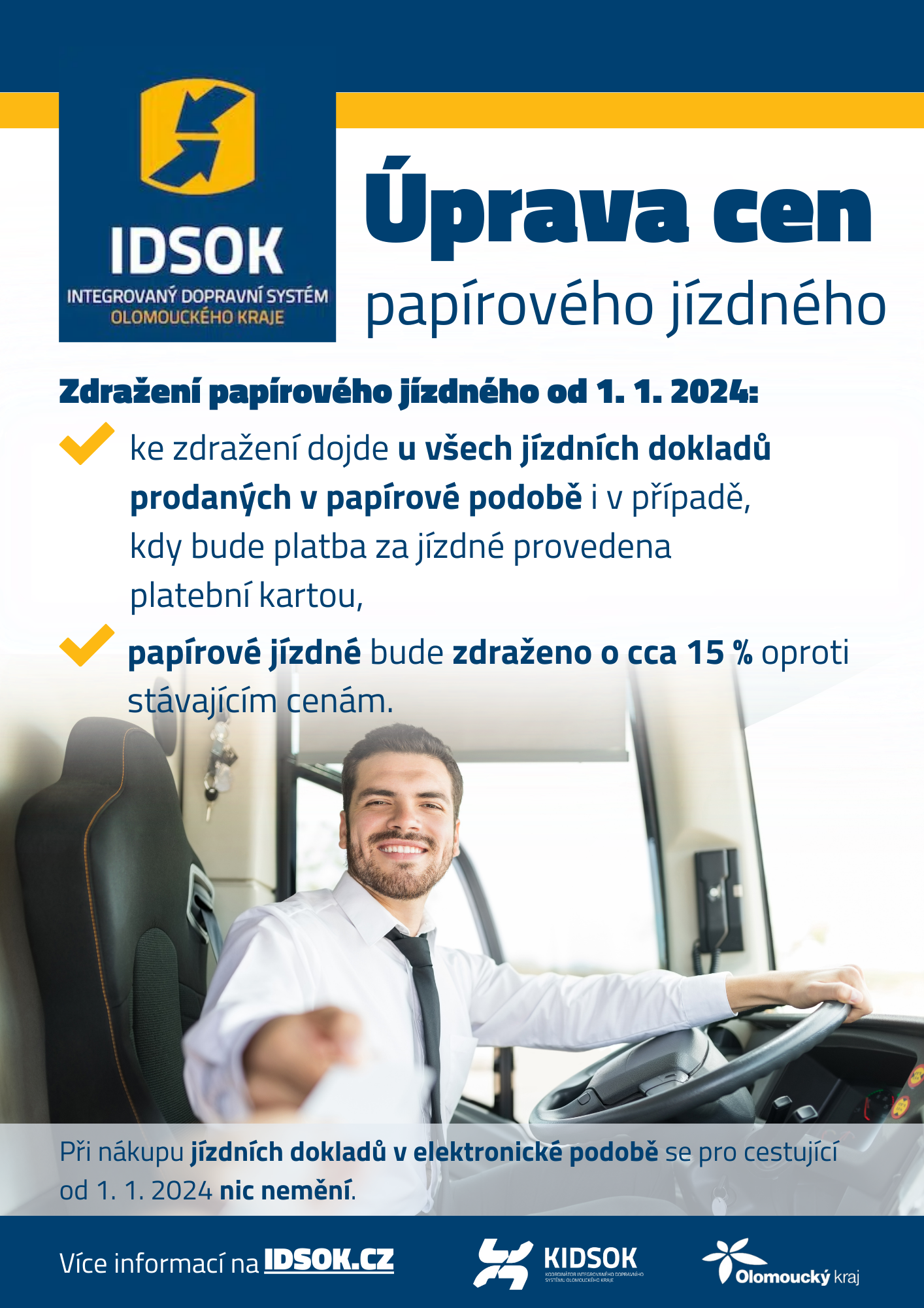 v termínu 1. 1. 2024 dojde u všech jízdních dokladů prodaných v papírové podobě, a to i v případě, kdy bude platba za jízdné provedena platební kartou ke zdražení cca o 15 % oproti stávajícím cenám. Zdražení se nedotkne jízdních dokladů za zavazadlo, psa a kolo a také se neprojeví v ceníku C (ceníky jednotlivých MHD).