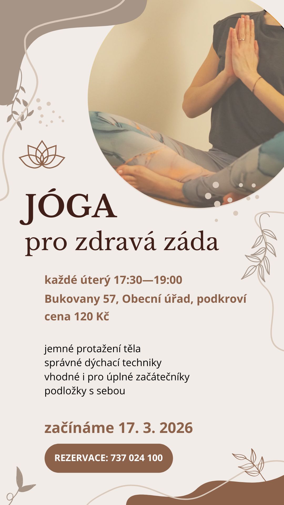 Od 17.3.2026 začnou probíhat nové lekce jógy zaměřené na zdravá záda. Vždy v úterý od 17.30 do 19.00 na půdě obecního úřadu. Nutná rezervace.