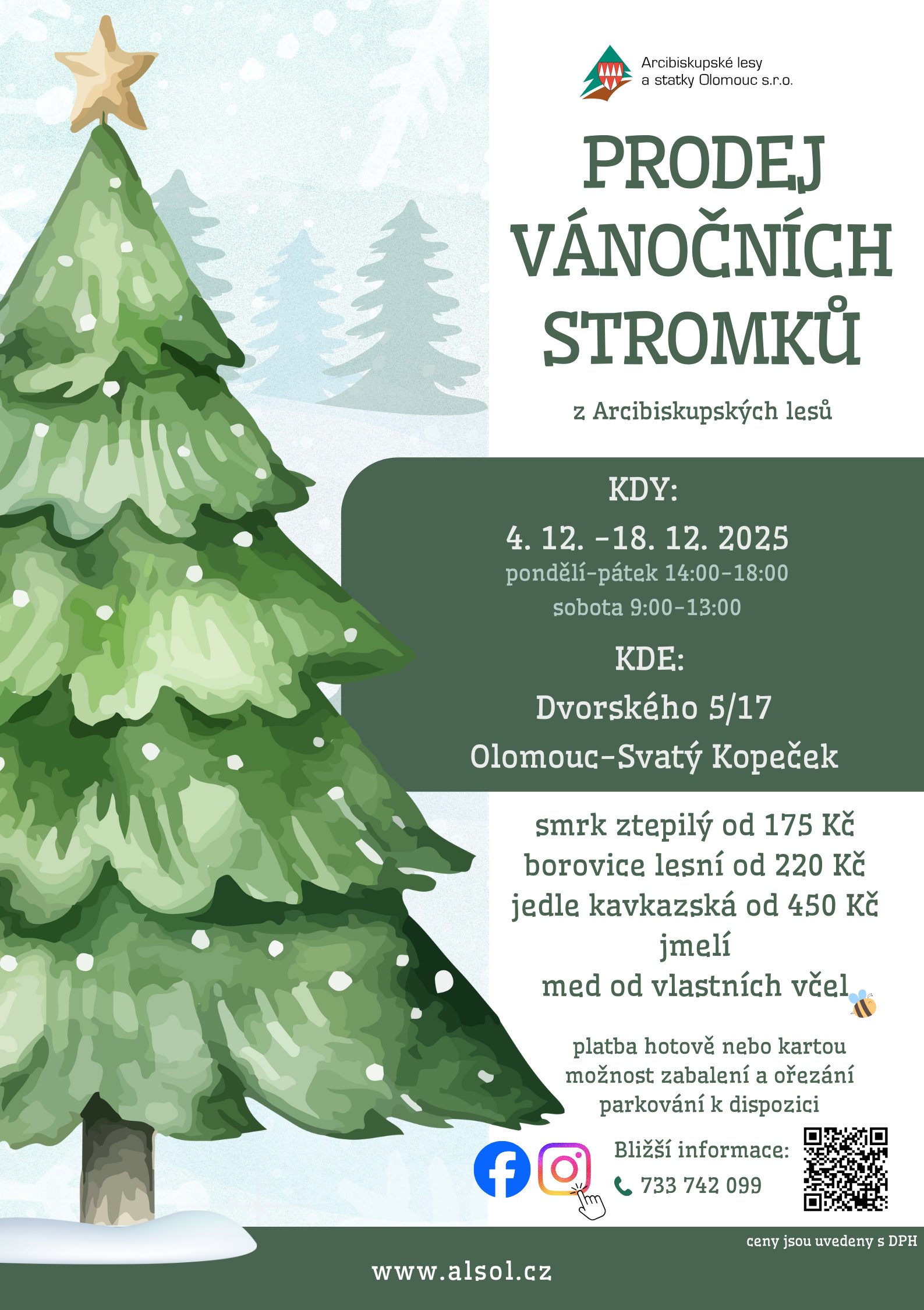 Od 4.12. se budou na Svatém Kopečku (Dvorského 5/17) prodávat vánoční stromky z Arcibiskupských lesů. Na místě si budete moci zakoupit i jmelí z Podzámecké zahrady Arcibiskupského zámku v Kroměříži a med. Ceny stromků začínají od 175 Kč za smrk ztepilý, od 220 Kč za borovici lesní/černou a od 450 Kč za jedli kavkazskou. Platba je možná kartou i hotově, stromek Vám ořežou i zabalí. Prodej stromků probíhá do vyprodání zásob.